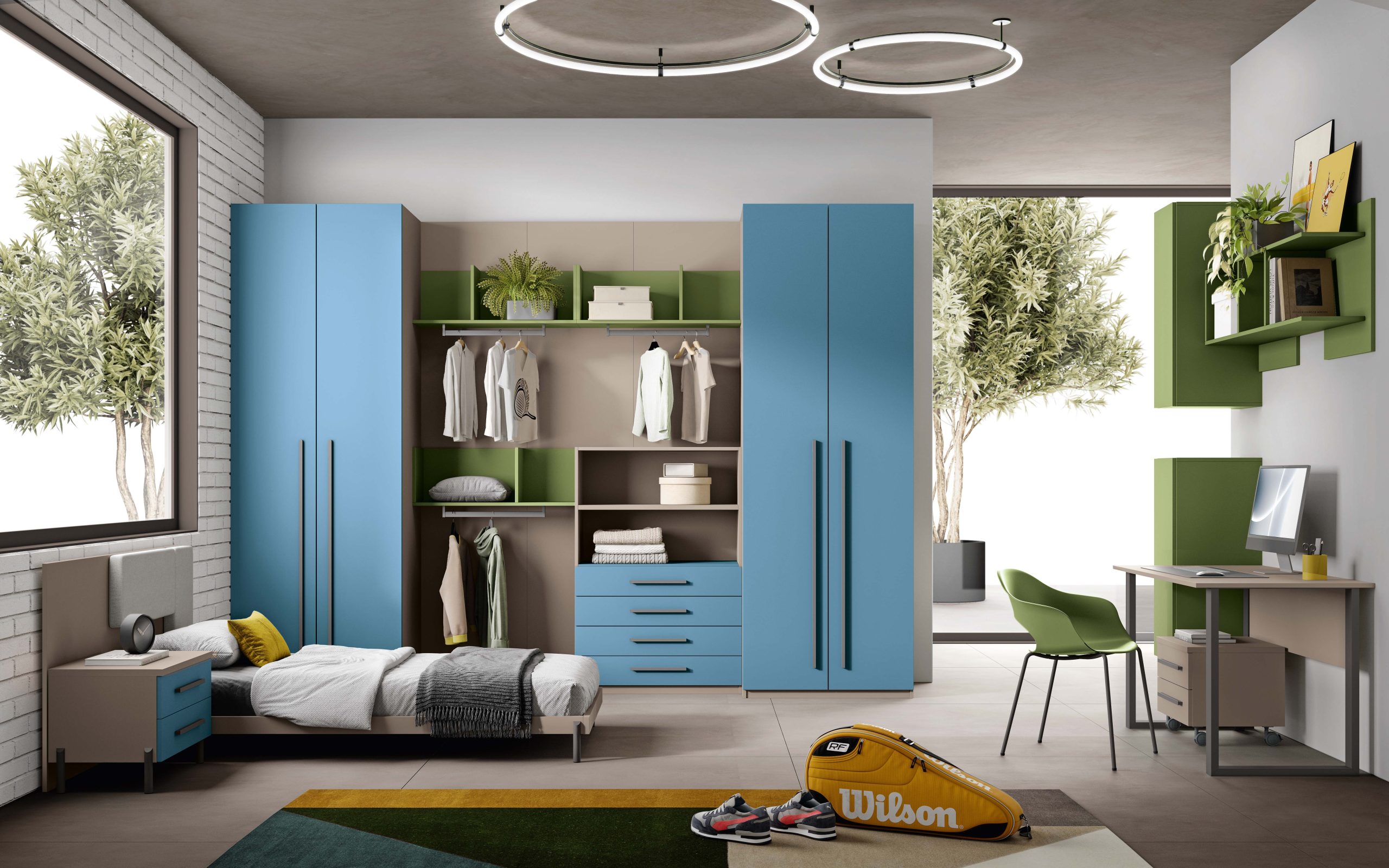 Le camere per ragazzi che proponiamo combinano modernità e funzionalità in un equilibrio perfetto. Forme essenziali e colori vivaci si uniscono in un design ispirato alle tendenze contemporanee, conferendo a ogni stanza uno stile giovane e dinamico.