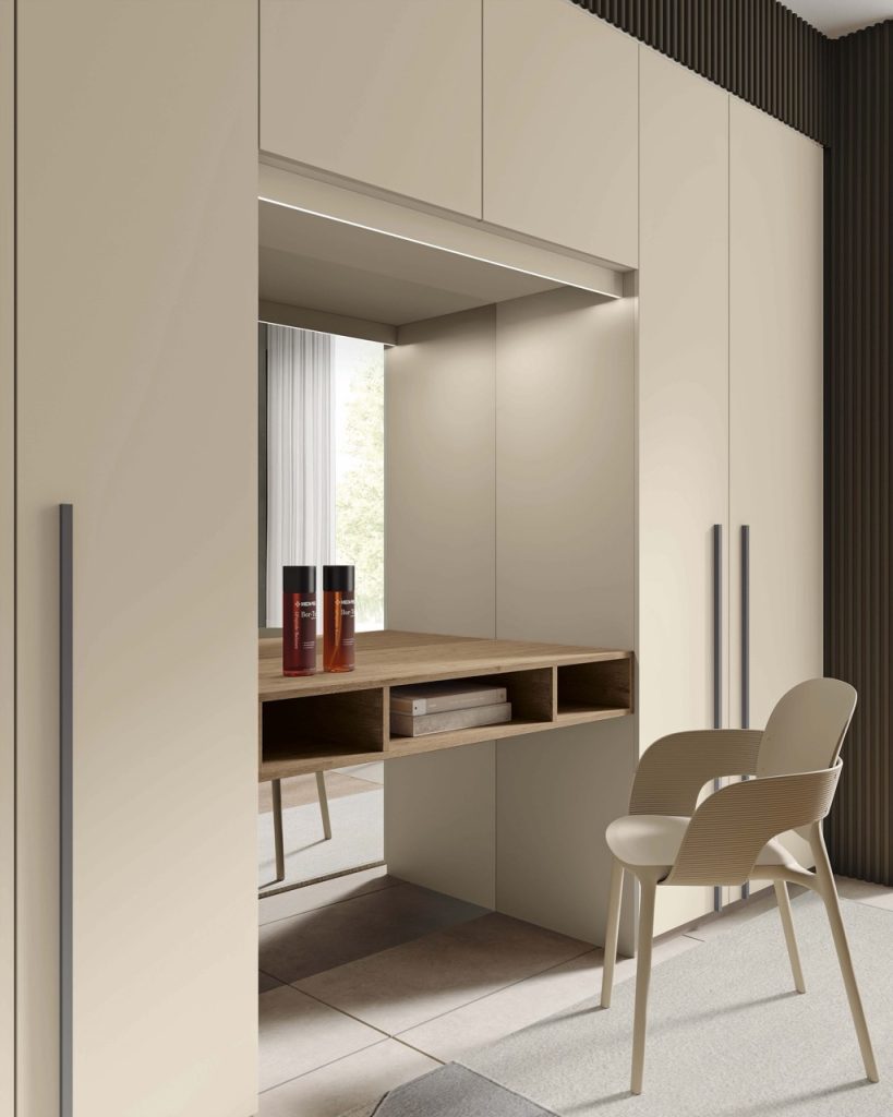 L’elemento distintivo di questa soluzione è il piano integrato, perfetto come angolo beauty o zona studio, completato da vani a giorno che permettono di avere tutto a portata di mano. L’armadio si sviluppa su due pareti, garantendo una grande capacità contenitiva senza appesantire l’estetica della stanza. L’uso di materiali pregiati e finiture eleganti rende questa composizione un perfetto equilibrio tra modernità e comfort. Le finiture selezionate contribuiscono a creare un’atmosfera calda e accogliente.