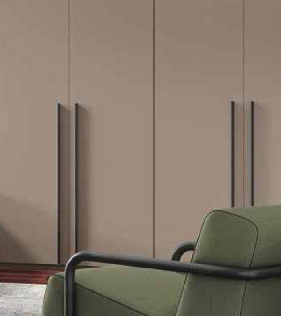 La configurazione dell’armadio a battente si distingue per l’integrazione di vani con ante in vetro Stop Sol, che aggiungono un tocco di leggerezza e trasparenza alla struttura.