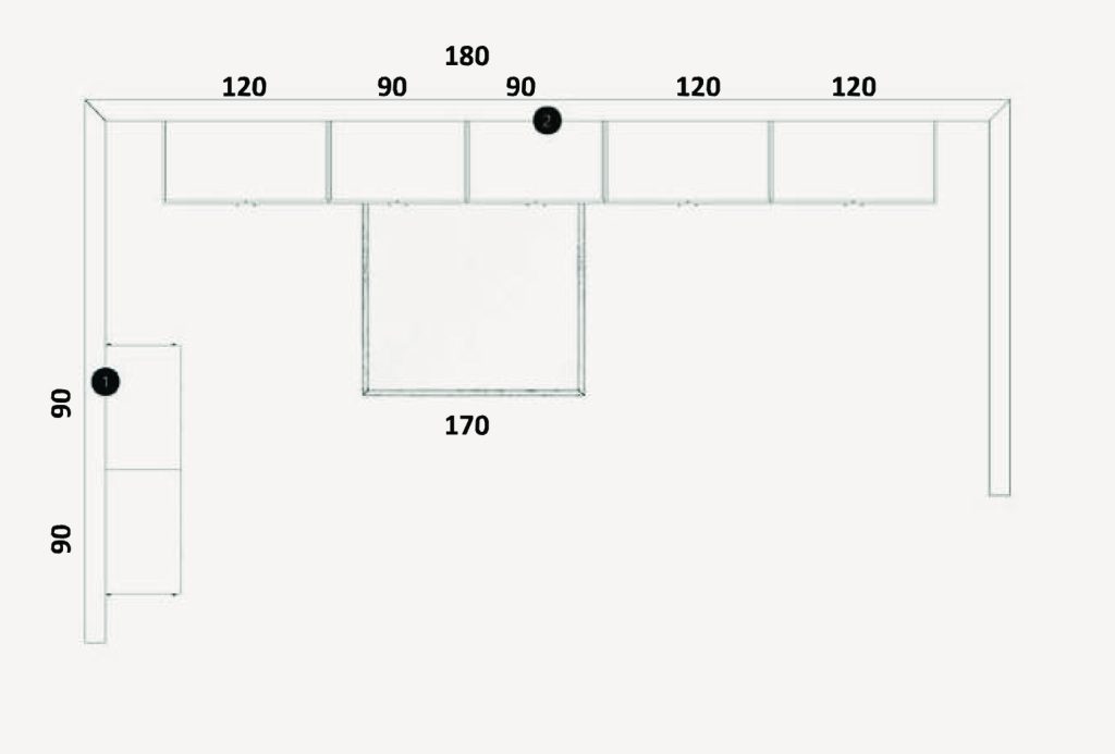 La composizione dell’arredo è studiata per garantire il massimo comfort e praticità: l’armadiatura si sviluppa in modo avvolgente attorno al letto, ottimizzando gli spazi e offrendo un’ampia capacità contenitiva. Il letto imbottito con finiture tessili si inserisce armoniosamente nella struttura, creando una continuità visiva che esalta la pulizia delle linee e il minimalismo del design.